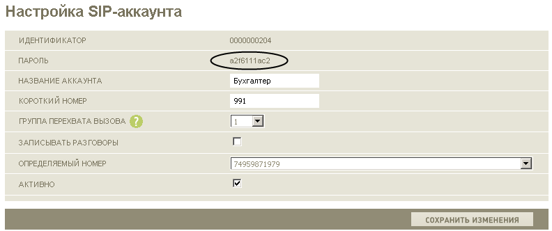 - Password: пароль SIP линии взятый из раздела Настройка SIP-аккаунтов (иконка главного меню)