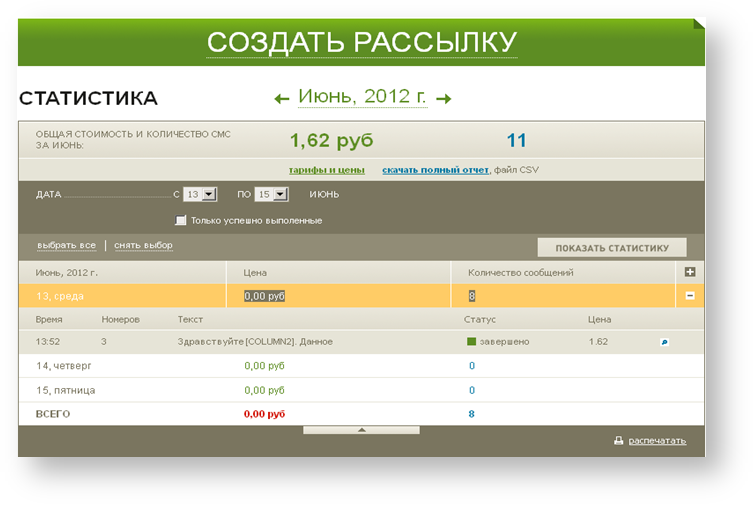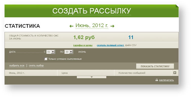 Отчет о проведенных SMS рассылках вы можете просмотреть в разделе «СТАТИСТИКА».