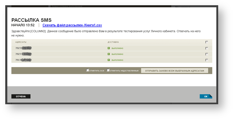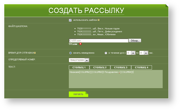 Далее в Личном кабинете на странице создания рассылки SMS нужно отметить галочкой поле «использовать шаблон» и загрузить в Личный кабинет подготовленный CSV файл.