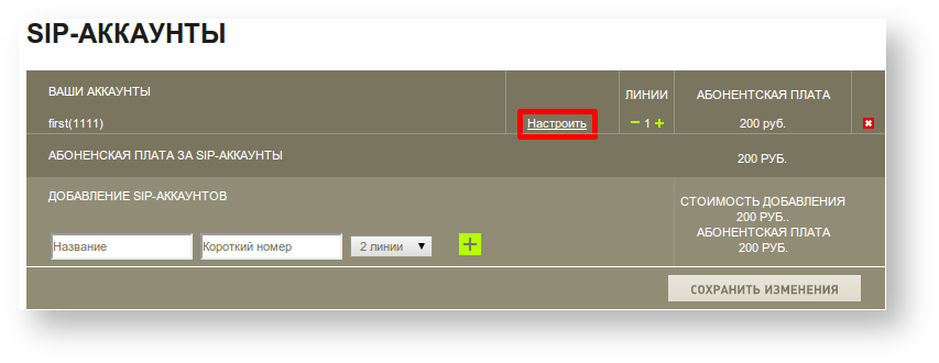 - Кликнуть по ссылке "Настроить" напротив нужного SIP-аккаунта