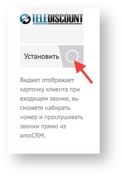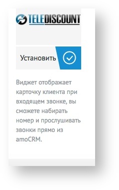 2) Заходим в свой аккаунт AmoCRM, раздел "Интеграции" и в самом конце в разделе "Пользовательские виджеты" находим виджет ВАТС "ТЕЛЕДИСКОНТ". Если в общем списке виджетов его нет, то архив с виджетом можно скачать по ссылке widget.zip и установить через “Настройки”->”API” в AmoCRM (см ниже раздел “Как загрузить виджет из архива”). После установки в списке виджетов должен появится виджет ВАТС "ТЕЛЕДИСКОНТ", как на картинке.