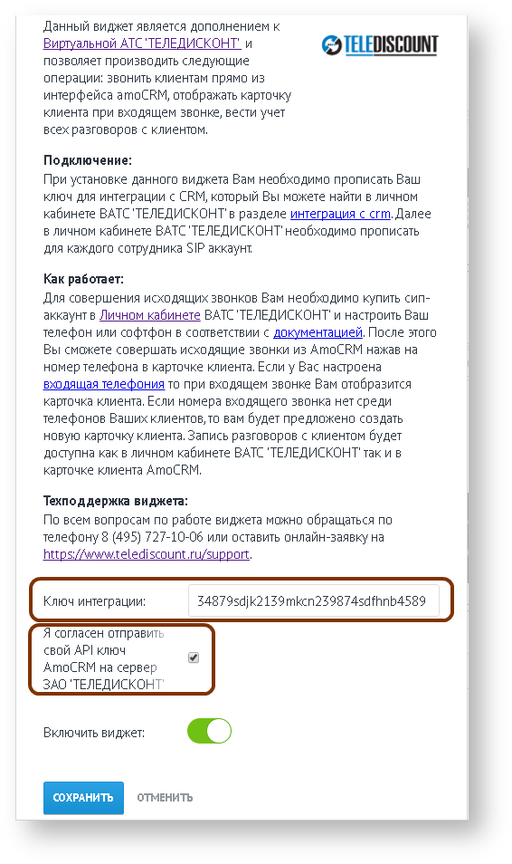 Проставляем галочку напротив "Я согласен отправить свой API ключ AmoCRM на сервер ЗАО 'ТЕЛЕДИСКОНТ'"