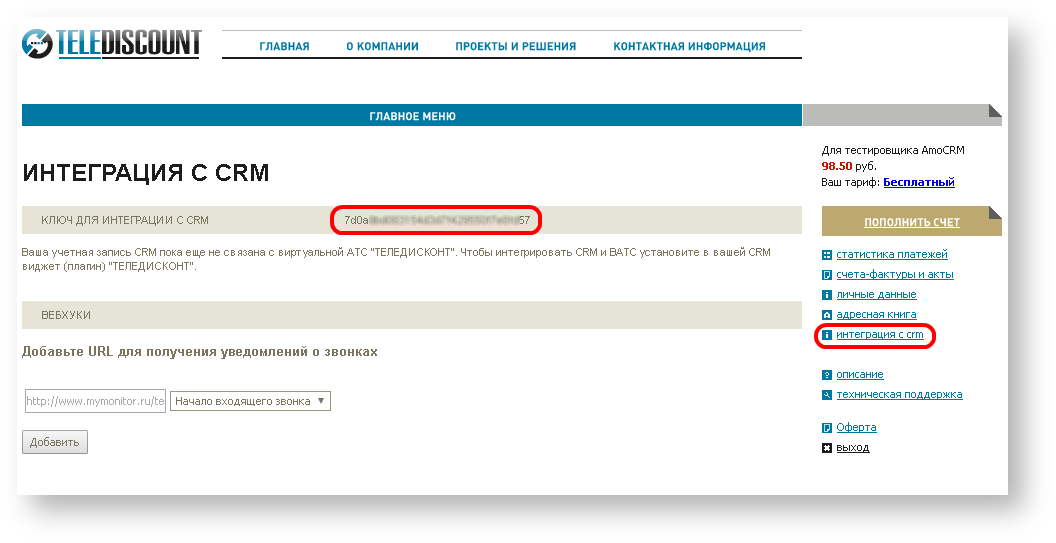 1) Заходим в свой личный кабинет ВАТС "ТЕЛЕДИСКОНТ", раздел “интеграция с CRM”, копируем ключ для интеграции.