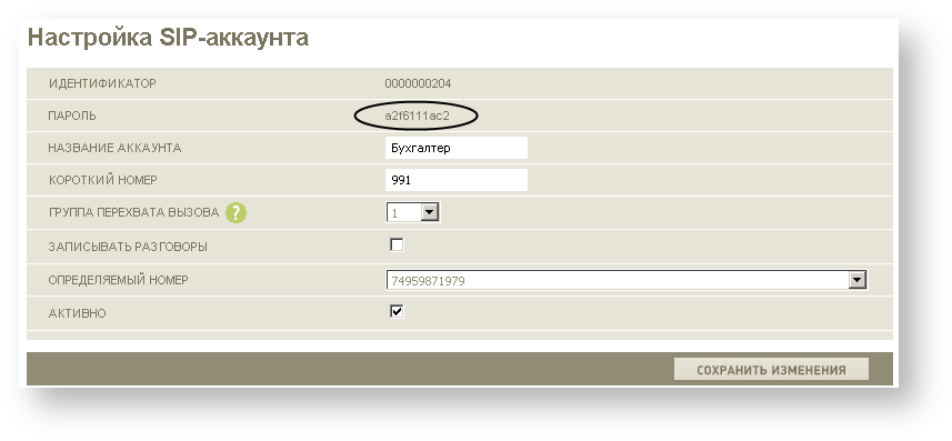 - Password: пароль SIP линии взятый из раздела Настройка SIP-аккаунтов (иконка главного меню)